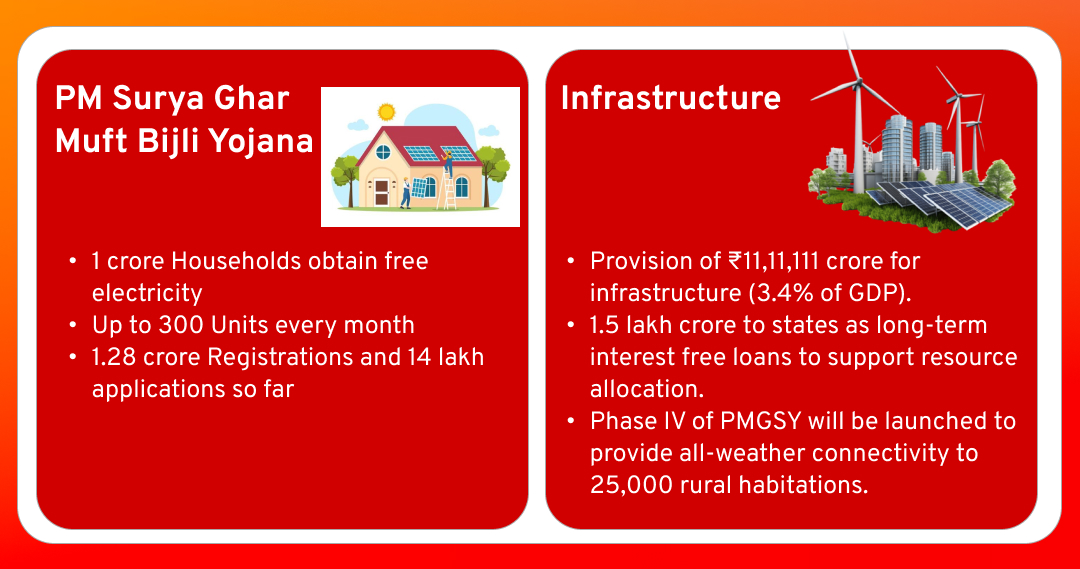- The Finance Minister said that conforming to the announcement made in the interim budget, there is the PM Surya Ghar Muft Bijli Yojana to provide for rooftop solar plants, enabling 1 crore homes to get free power up to 300 units per month.
