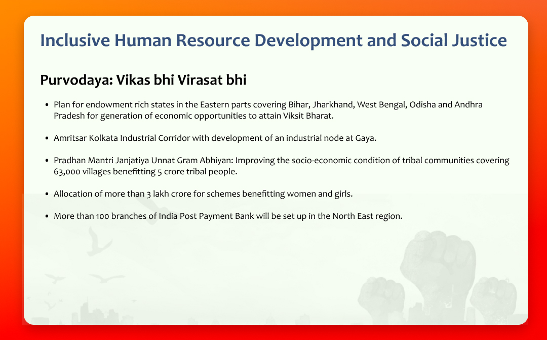 - Finance Minister has laid emphasis on the Inclusive human resource development and social justice & had far-reaching schemes in economic activities of craftsmen, artisans, self-help groups, SC/ST & women entrepreneurs & street vendors.
