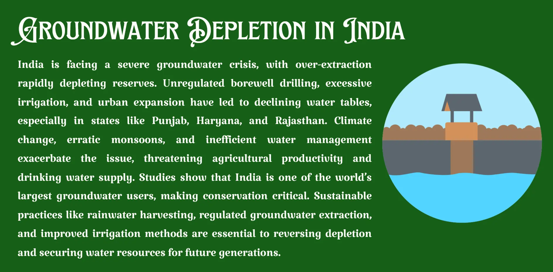 As a result of failing irrigation systems, most farmers depend excessively on groundwater extraction. Over-pumping depletes the underground reserves that result in land subsidence, low water quality and a major environmental degradation. With lack of strict regulations and sustainable practices, groundwater depletion is an issue of great urgency.