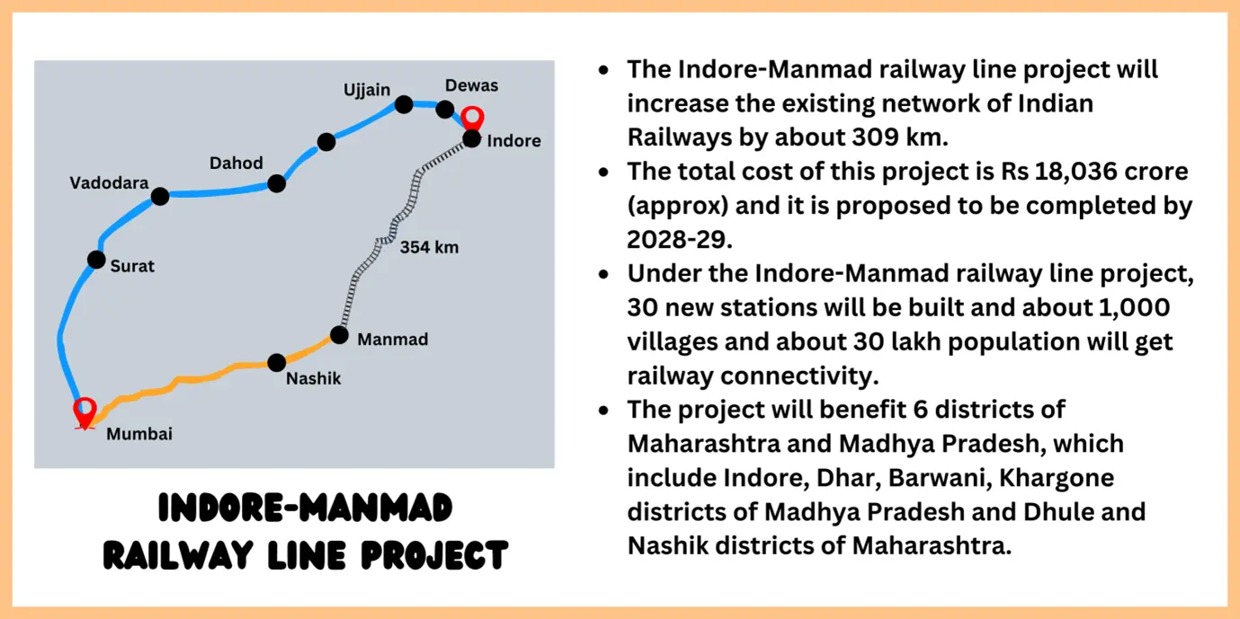 - The Indore-Manmad railway line project will increase the existing network of Indian Railways by about 309 km.
